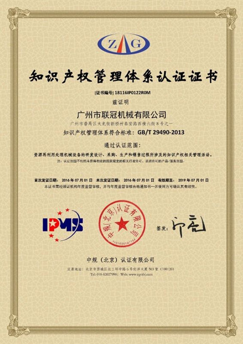 2016年7月,3E机械顺利获得了中规(北京)认证公司的《企业知识产权管理规范认证证书》,由此成为全国通过国家知识产权局《企业知识产权管理规范》认证的企业之一。截至2016年7月,3E广州联冠机械有限公司的“3E”商标已在全球37个国家注册备案,分别是美国、英国、德国、法国、瑞典及欧洲多国,日本及亚洲多国,系列产品更拥有30个实用新型专利,1个发明专利,1个外观设计专利的非凡战绩。