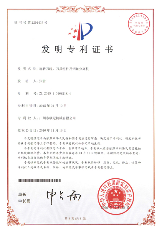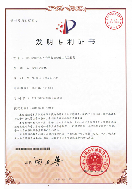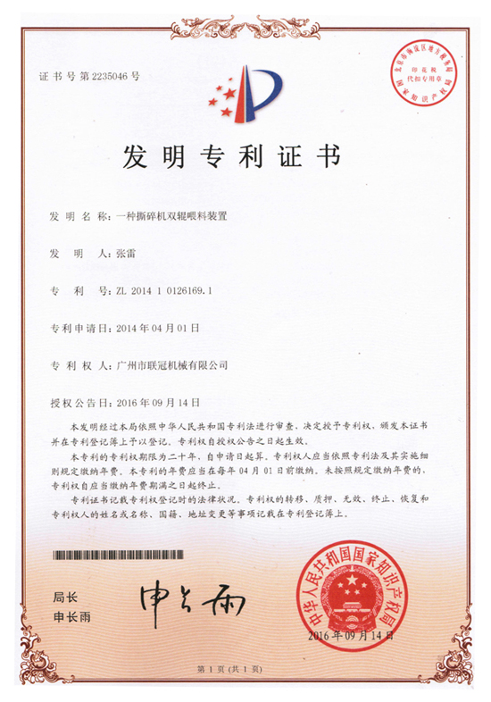 3E广州联冠机械的技术研发小组凭借多年的研发与积累,从简单的“逆向创新”——外观完善并获得多项外观设计专利;到核心技术的不断探索、攻关——“正向创新”,妥妥的国家发明专利3项已写入公司战绩,分别是旋转刀辊、刀具组件及钢丝分离机(ZL201510169218.4),撕碎机双辊喂料装置(ZL201410126169.1),废旧汽车外壳回收前处理工艺及设备(ZL201010624847.9),另外还有20余项发明专利正在申报中。