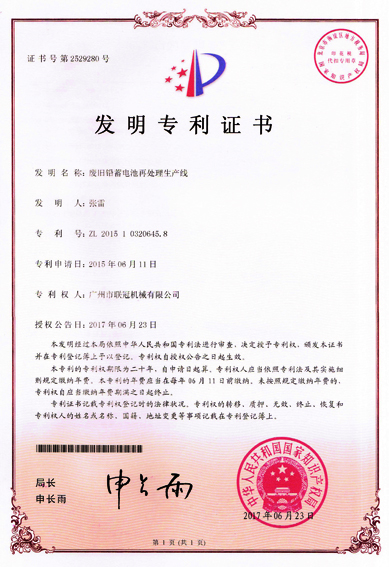 喜报│3E机械斩获废旧铅蓄电池再处理生产线发明专利