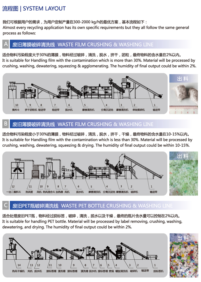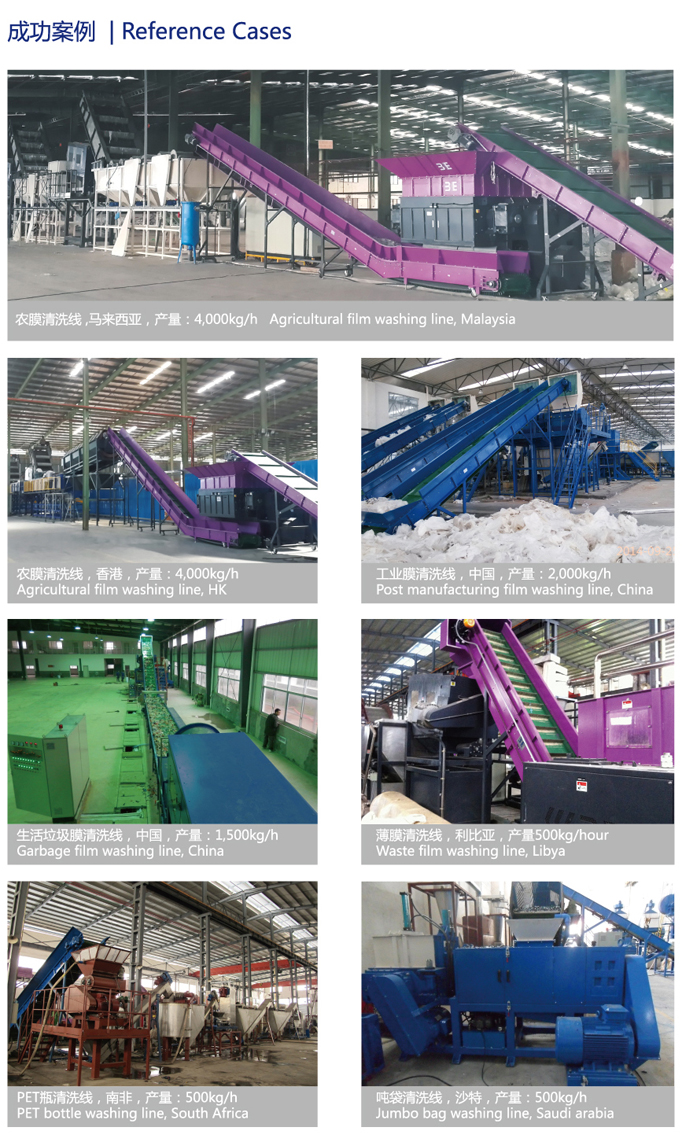 适用于不同污染程度的PE/PP薄膜、生活垃圾塑料、废旧农膜地膜大棚膜、工业包装膜、工业废弃膜、PET瓶等废料的破碎、清洗、分离、干燥、包装,把废旧塑料变成可循环再利用的原料。整条生产线从废料到成品,具有操作简易,效率高,环保,节能等特点。