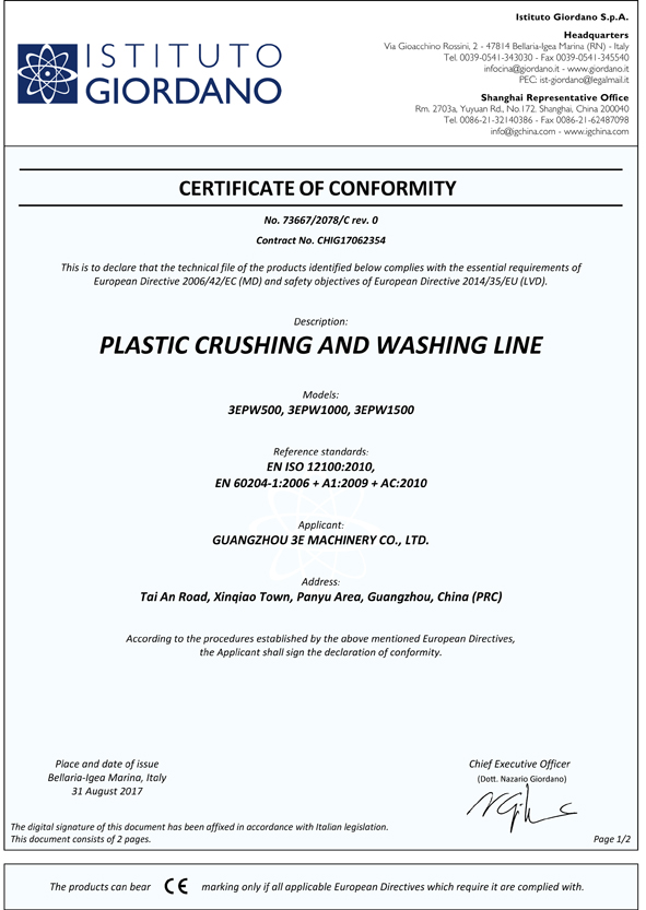3E机械是国内首家生产废塑料回收设备厂家,服务于全球客户超过90多个国家和地区。2017年,3E机械通过欧盟专业机构的审核并获得了CE认证,对安全要求更进一步,高标准地为全球客户服务,为生产安全保驾护航。