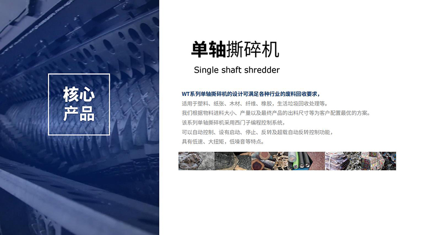 WT系列单轴撕碎机的设计可满足各种行业的废料回收要求,可回收材料种类繁多。我们根据物料进料大小、产量以及最终产品的出料尺寸等为客户配置最优方案。