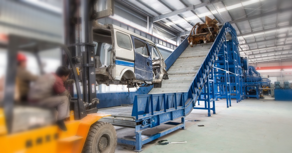 废旧汽车外壳(金属)破碎回收线,是针对报废汽车外壳、废旧金属进行破碎回收的设备,便于回炉再生循环利用。主要由专用的重型金属撕碎机进行粗碎,然后经过锤式破碎机进行破碎处理,在破碎时采用风力设备除去轻质物料以及粉尘,通过强磁设备把含铁为主的金属分离出来,通过涡电流分选机把有色金属和塑料分离出来。本系统全程采用PLC控制,动态实时监控。具有单位能耗低、处理量大、经济性好、维护成本低、处理效果好,对输入电源的容量要求低等特点。